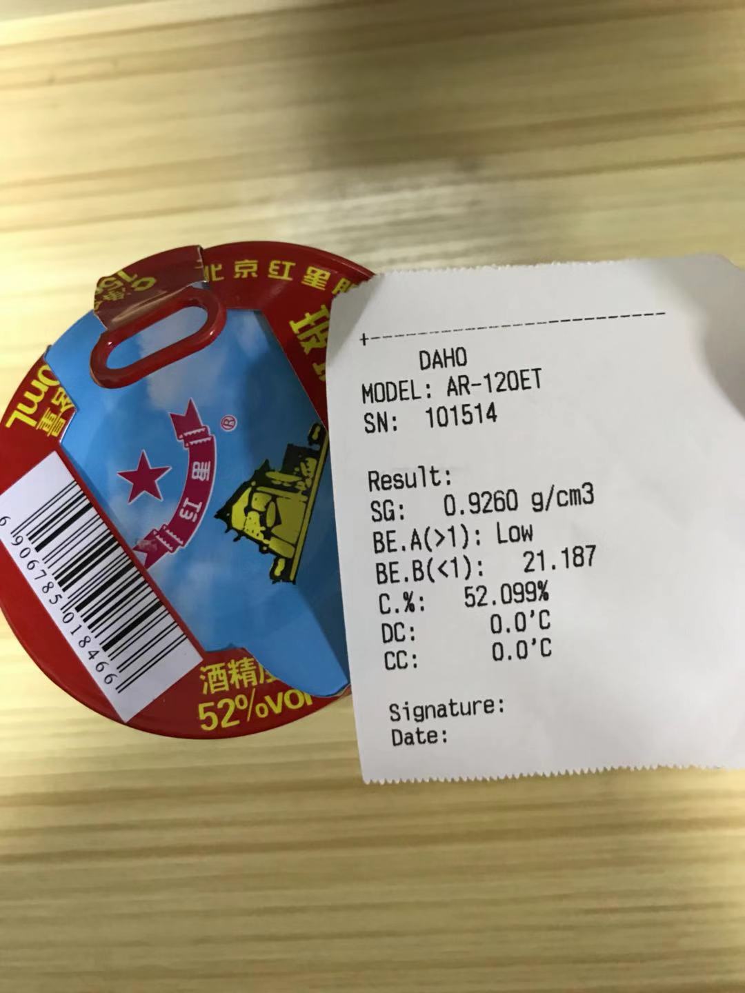 四川的王先生開的一家釀酒廠,需要測試白酒的含量,但以往并未用過我們這種臺式數(shù)顯式的濃度計(jì),擔(dān)心測試不準(zhǔn)確。為讓客戶放心,我公司特地買了一瓶白酒(酒精含量52%),并錄制了測試視頻,測試結(jié)果與白酒本身的含量完全一致,再次證明宏拓儀器設(shè)備經(jīng)得起考驗(yàn)。儀器操作簡單,新手也能輕易操作,需要了解如何操作的,可點(diǎn)此鏈接進(jìn)行觀看,高精度酒精濃度計(jì)的操作視頻:http://m.laoguxiang.com/video_show.asp?id=184