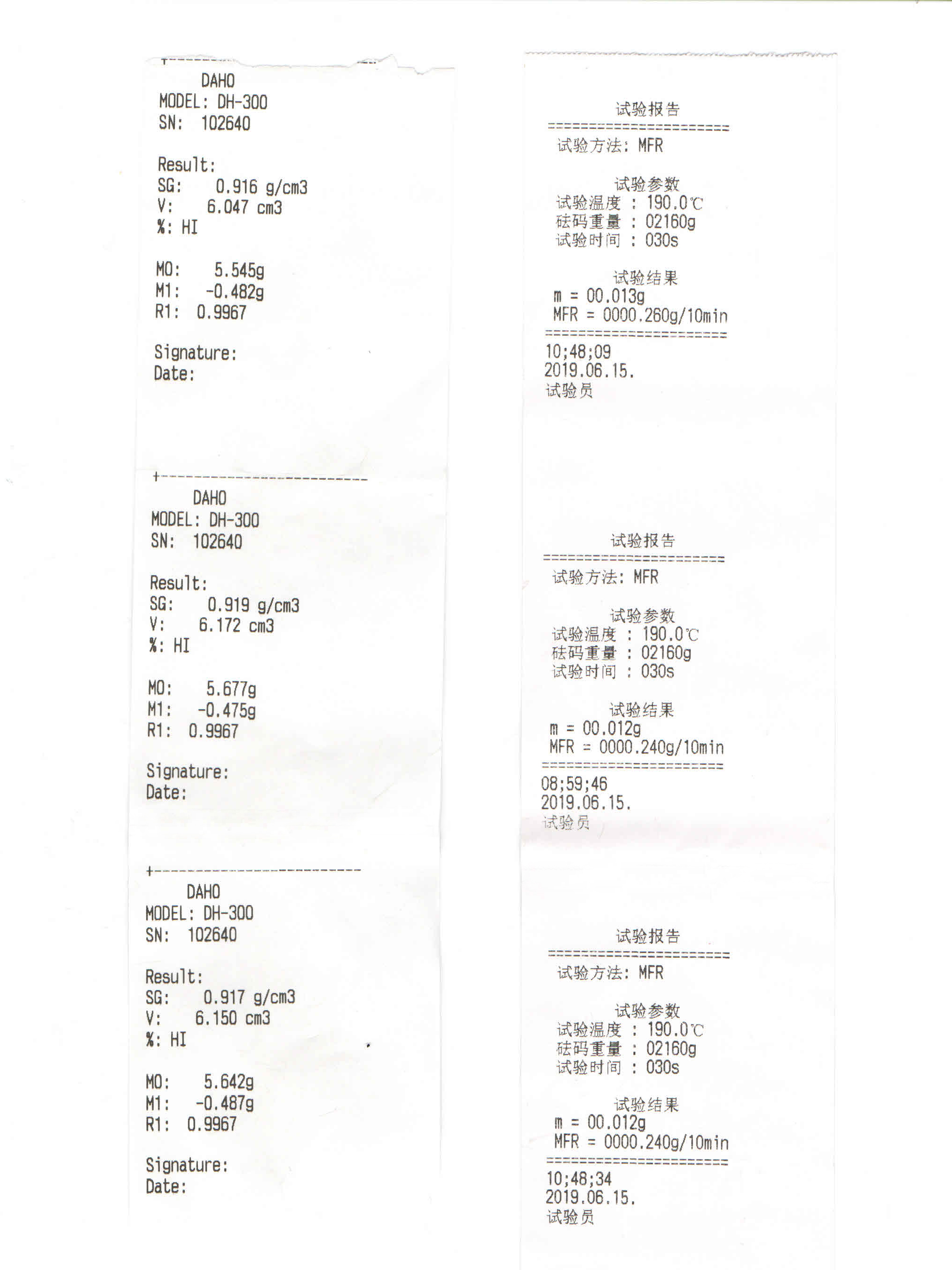 6月11日,海門普適的陳小姐聯(lián)系到我們,表明了公司的需求:測試PE塑料的熔體流動性與密度,精度沒有特別要求,經(jīng)濟實用就行。宏拓根據(jù)客戶需求推薦熔體流動速率儀HT-3682V-BA與密度計DH-300,發(fā)了一些相關資料參數(shù)后,客戶表示儀器功能與參數(shù)都沒問題,主要擔心測試不精準,經(jīng)過幾番溝通,最終決定先郵寄一些樣品過來測試,數(shù)據(jù)準確的話再考慮采購。幾天后,收到客戶寄來了一大包PE塑料樣品,當天并安排了測試,測試結果如下: